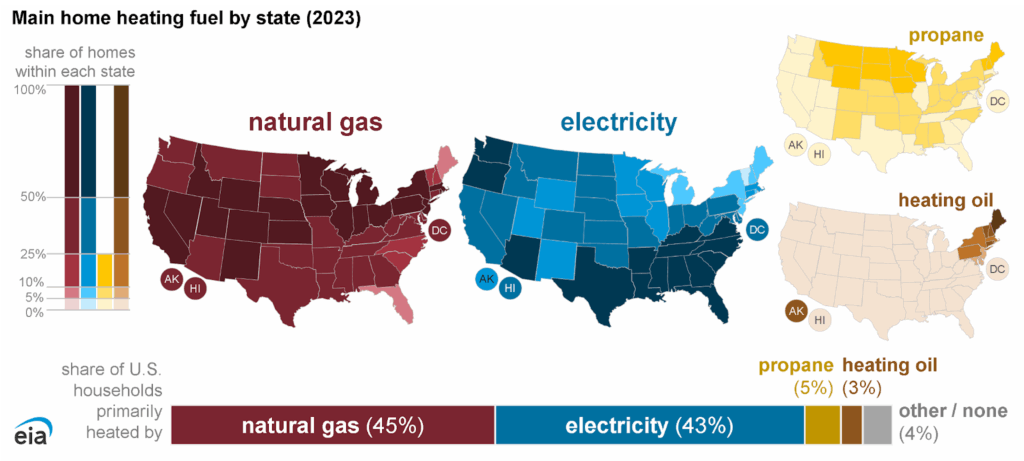 According to the U.S. Energy Information Administration’s Winter Fuels Outlook published in October 2024, natural gas is the primary space-heating fuel in 45 percent of U.S. households (eia.gov).